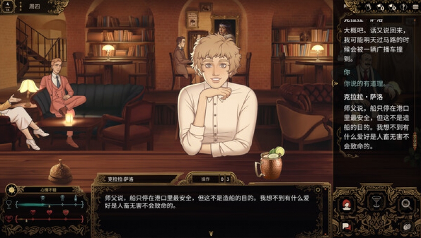 每日经营需平衡调酒效率、顾客互动与资源分配,连续失误将导致酒吧声誉下降,触发“卫生检查”“黑帮勒索”等随机事件。夜间推理阶段存在时间限制,超时将直接导致Game Over。