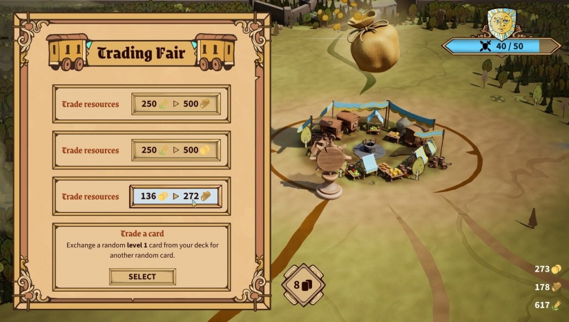 超过110张卡牌分为地形、建筑、军事三大类,形成多样化的战术组合。例如,“樵夫”卡可将相邻森林转化为木材,“弓兵营”需依托平原地形发挥射程优势。卡牌升级与市场交易系统进一步扩展策略维度,玩家可通过局外成长解锁新卡组。