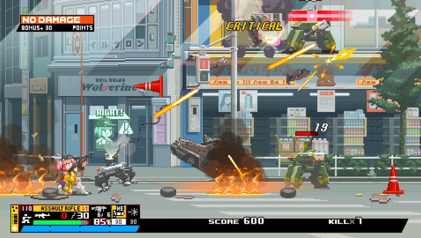 简中《硝基特快》是一款由Grayfax Software开发、PLAYISM发行的2D横版射击游戏。游戏以未来东京特别行政区内瀞市为舞台,玩家将化身美少女特工,加入「特异车辆处理班」AVDS,对抗威胁城市安全的失控无人机与装甲机械。核心玩法围绕无限子弹的热武器倾泻与12种战术副武器搭配展开,从EMP脉冲、遥控无人机到反坦克导弹,可自由切换应对装甲车、武装直升机等高强度目标。战斗强调动态走位与武器特性利用——冲锋枪支持移动射击,重型枪械需稳定瞄准,配合360°全向瞄准系统,实现爽快的弹幕对抗。