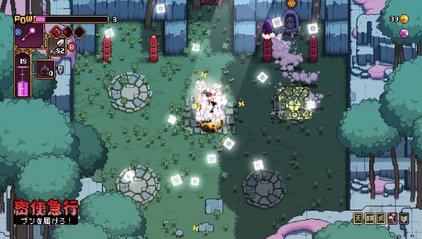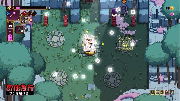 游戏采用复古像素美术风格,场景设计融合日式神社建筑与奇幻元素,如飘动的旗帜、雨滴粒子特效等细节赋予世界灵动感。战斗动画流畅,赤蜜扩散与天诛攻击的光效层次分明,凸显动作张力。角色设计由知名插画师kantaro(曾参与《宝可梦》卡牌创作)主笔,主视觉图色彩浓郁,角色形象兼具少女感与神秘气质。