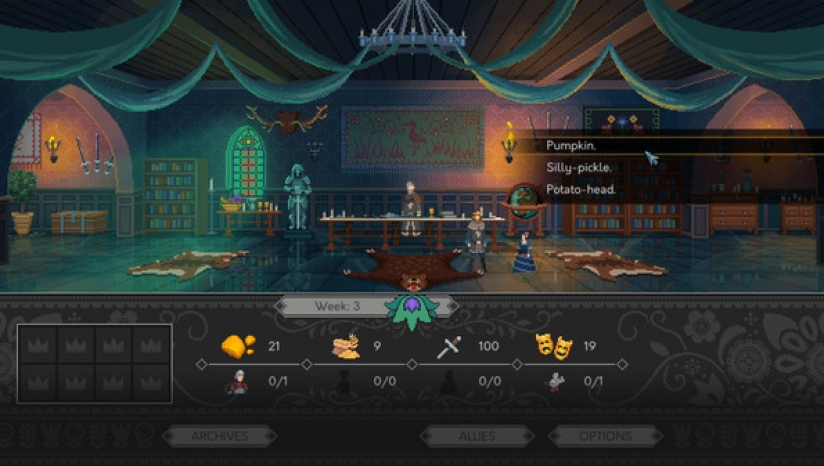 《遵命,陛下》是由Brave At Night开发、No More Robots发行的中世纪策略模拟游戏。玩家将扮演国王艾瑞克,在达文王国面临战争威胁的背景下,通过每回合处理臣民上访、调配资源、应对随机事件来维系王国运转。游戏融合策略管理与角色扮演元素,需平衡金币、物资、兵力与民意等资源,在解决农民求助、贵族结盟、家庭危机等事务中做出艰难抉择,例如是否牺牲女儿的婚姻换取盟友支援,或冒险派遣将领营救被绑架的领主女儿。其独特的像素风格与斯拉夫民俗文化结合,营造出神秘阴郁的中世纪氛围,而国王与三个女儿的情感互动则为沉重的治国叙事注入温情。