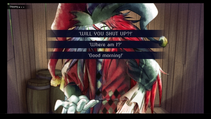 《Trapped with Jester》采用典型的日式视觉小说美术风格,场景以静态插画为主,注重光影与色彩的情绪表达。马车内部场景通过暗色调与血色点缀渲染压抑氛围,而小丑的造型设计尤为突出:夸张的服饰花纹、不对称的面部妆容,以及瞳孔中若隐若现的异色反光,均暗示其非人本质。游戏还通过动态文本效果(如抖动、渐隐)增强关键剧情的冲击力。Steam版附赠的DLC艺术集进一步扩充了角色设定稿与世界观草图,深化了玩家对恶魔契约体系的理解。