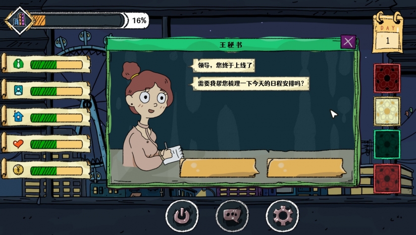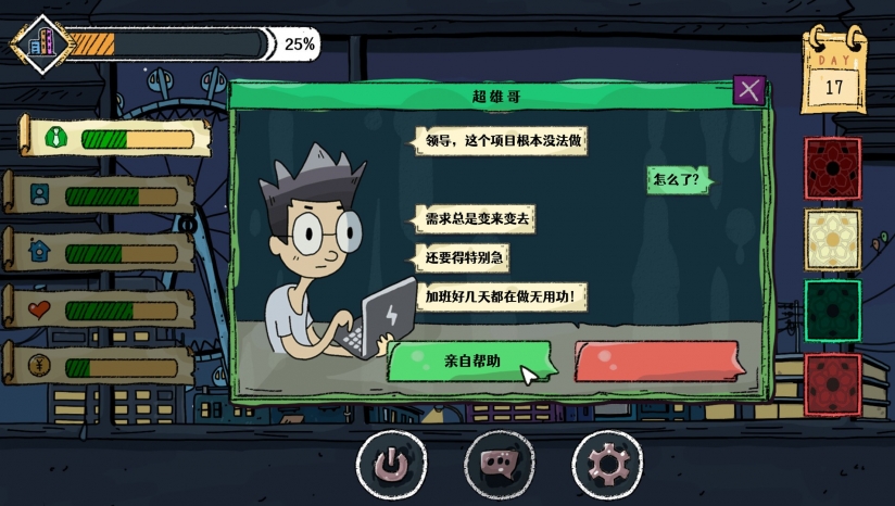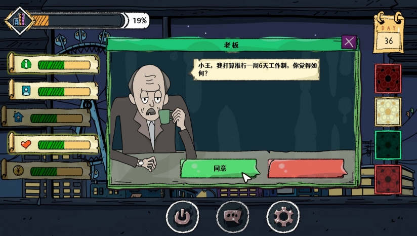 丰富的日常随机事件,通过选择不同的回应来小心平衡老板,下属,家庭,健康,金钱五个维度的数值,注意,每一次选择都可能瞬间逆转局势。