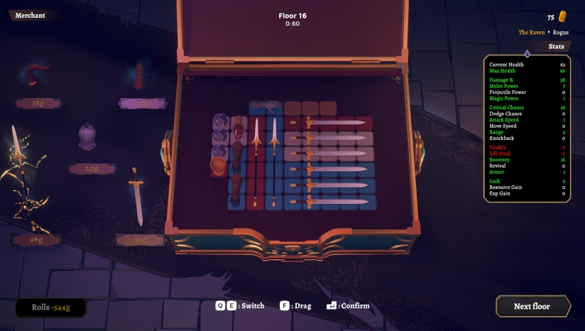 独特的“武器网格”设计是游戏的核心策略点。玩家需在有限背包空间中合理摆放武器和道具,利用相邻位置加成效果(如双刀相邻提升攻速)最大化战力。不同武器形状和属性标签(如远程、近战)需搭配特定道具(如吸血之心、攻速沙漏)形成Build。