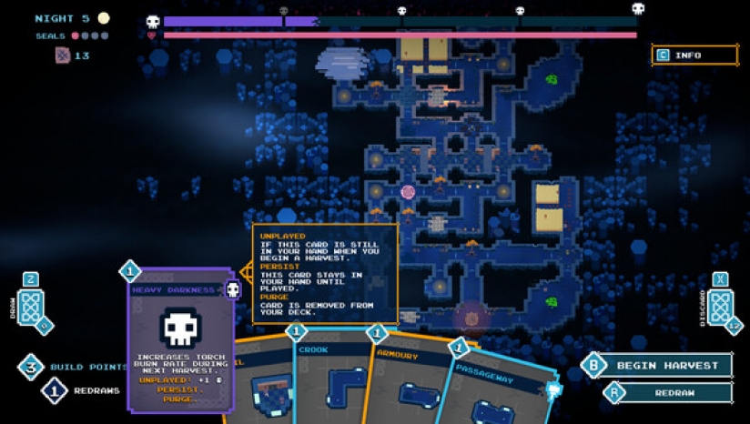 1、动态牌组与地牢建设:在游戏过程中创建你的地牢,使用多种卡牌放置房间、走廊等。通过赢得收割女神的眷顾或与遗迹中的角色互动,修改你的牌组。