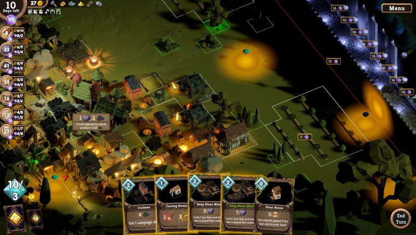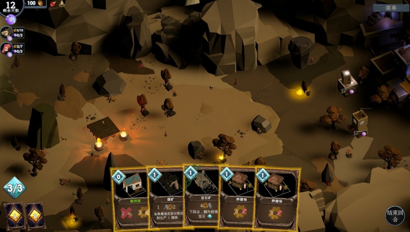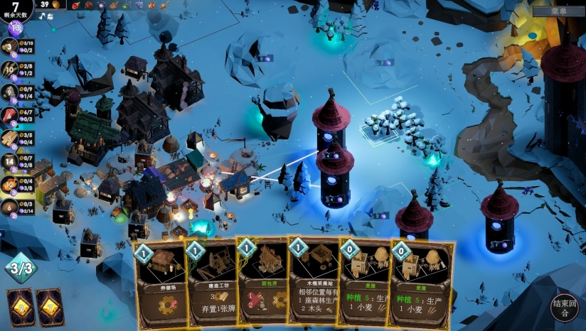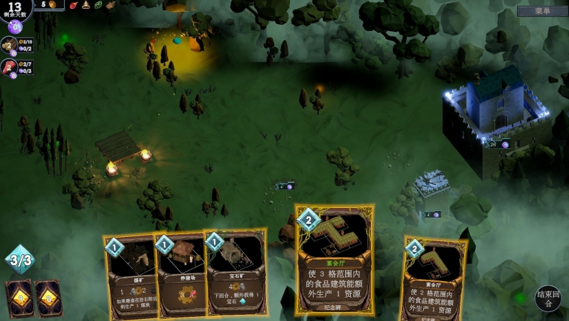 玩家通过构建“城镇牌组”来规划发展路线。卡牌代表建筑(如资源工厂、防御塔等),打出后可在敌方领地建造城镇。建筑分为生产型(持续产出木材、水晶等资源)和功能型(提供一次性奖励或永久增益),需合理分配资源以平衡扩张与防御。