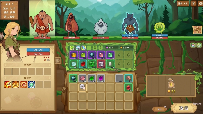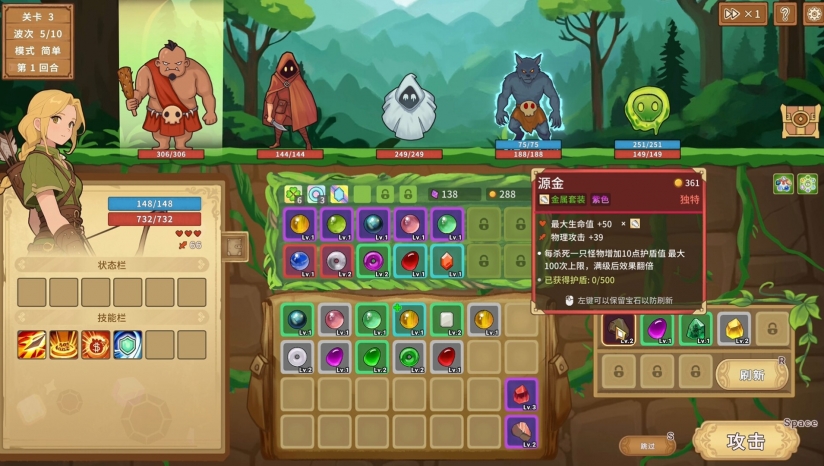 采用经典回合制战斗,每一步都可冷静规划。失败无惩罚,随时调整宝石组合,反复优化战术,直至构筑完美流派。