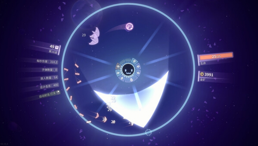 《激射超新星》是一款由独立开发者Jamesika制作发行的太空弹幕战斗游戏。游戏融合Roguelike、塔防与生存元素,玩家化身地球超智能体,操控可360度旋转的环形堡垒,通过发射弹幕抵御来自四面八方的外星敌群。核心玩法围绕动态构建防御体系展开:30余种科技组件与100余种道具可自由组合,形成闪电、寒冰、烈焰三大元素流派,触发元素连锁反应引发全屏爆炸。独创“动态塔防”机制将传统固定炮塔转化为可操控的旋转火力网,玩家需实时调整防御方向应对难度递增的敌人。
