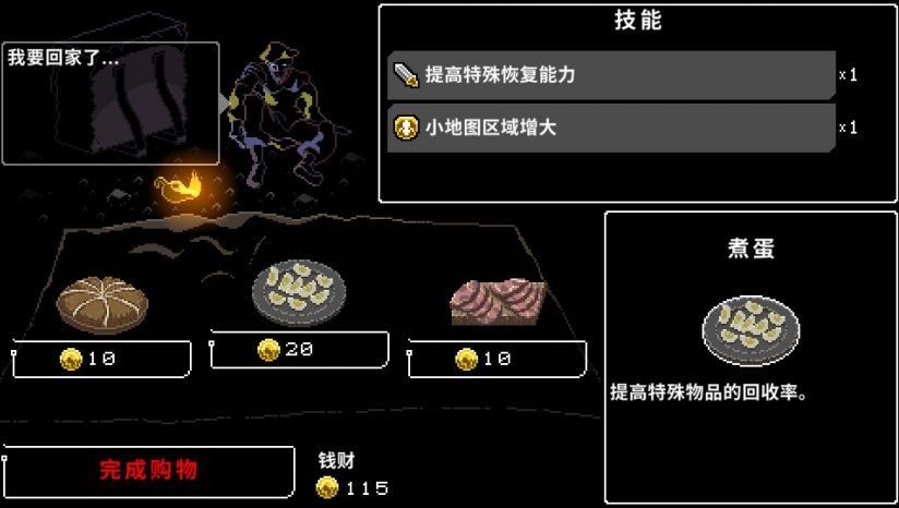 每撑过一天(约1分钟),商人会出现供玩家用金币购买回血道具、临时增益(如攻击附加剑气、拾取金币无敌等),并解锁新武器。