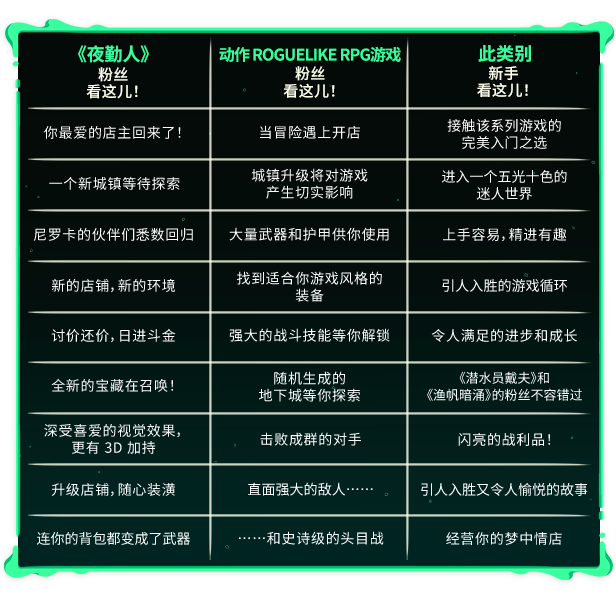 你和其他村民被困在了偏僻的特雷斯纳村。身无分文的你,必须打起精神,重整旗鼓,把你那简陋的小店打造成村庄的财富中心。探索危险重重的地下城,收集珍奇物品并进行贩售,再用收入投资朋友的生意。不断解锁全新的武器、盔甲和店铺装饰,当然还有更重要的任务——带来希望,让大家相信事态终有转机。