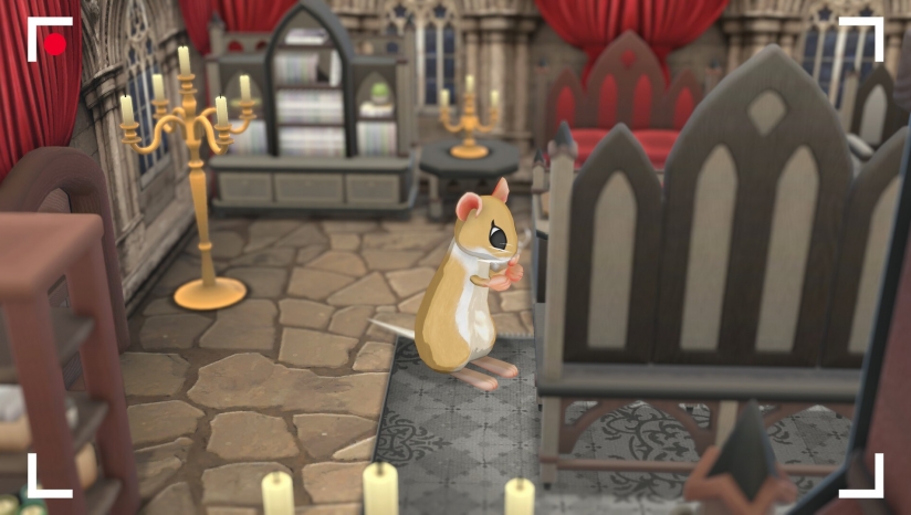 小鼠在装饰空间中自由活动(如蜷缩椅子、整理物品),赋予家园生命力。