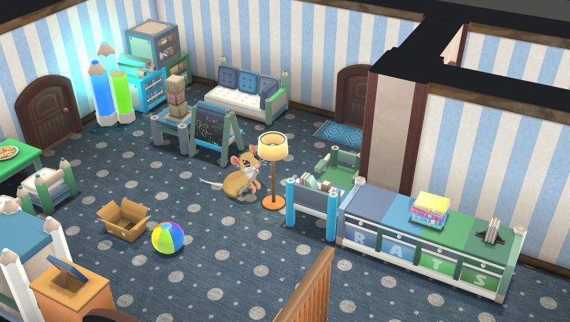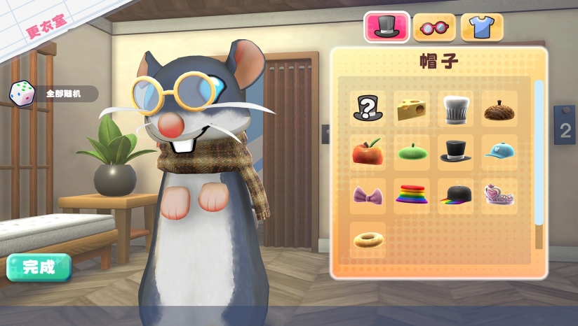 自由装饰3D家具,搭配壁纸、地毯等组成35套主题家居(如外太空、田园风)。通过"啮齿动物编辑器"定制小鼠毛色、尾巴长度及服饰。