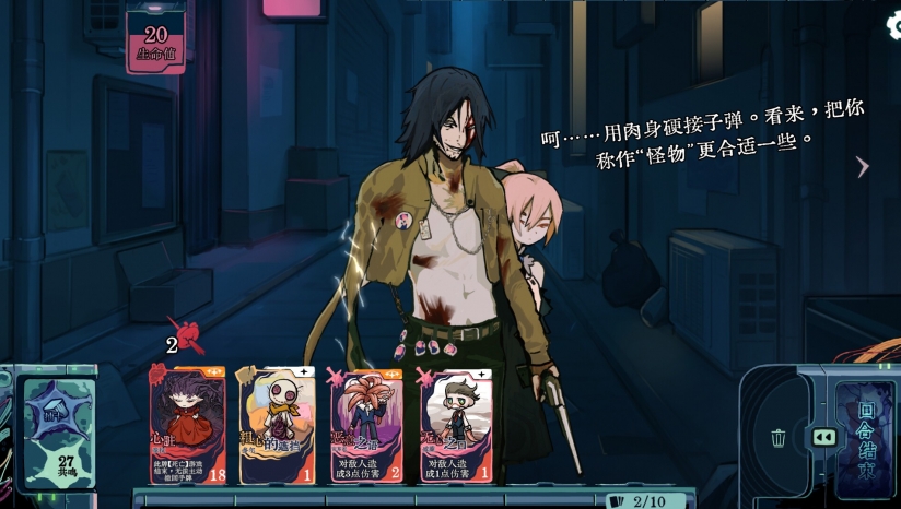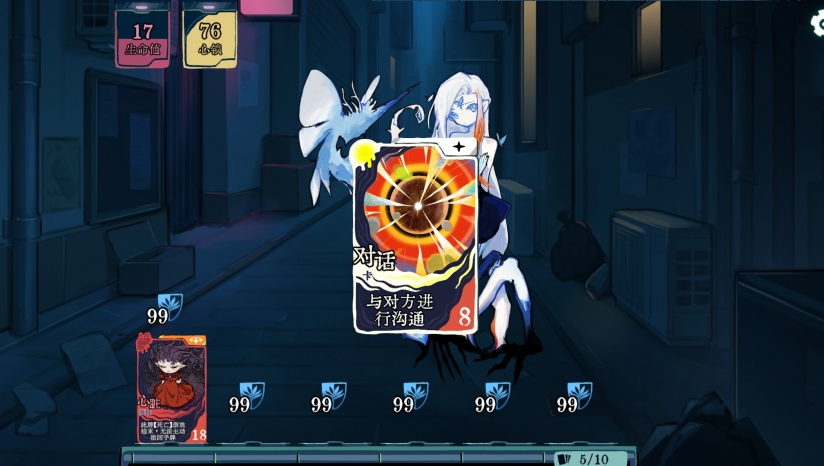 面对实验体时,可选择战斗或对话。战斗需运用卡牌组合击败对手;对话则通过“情绪卡牌系统”(正负情绪、自信怀疑组合)挖掘角色故事,影响剧情走向。
