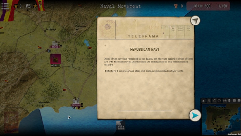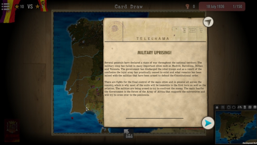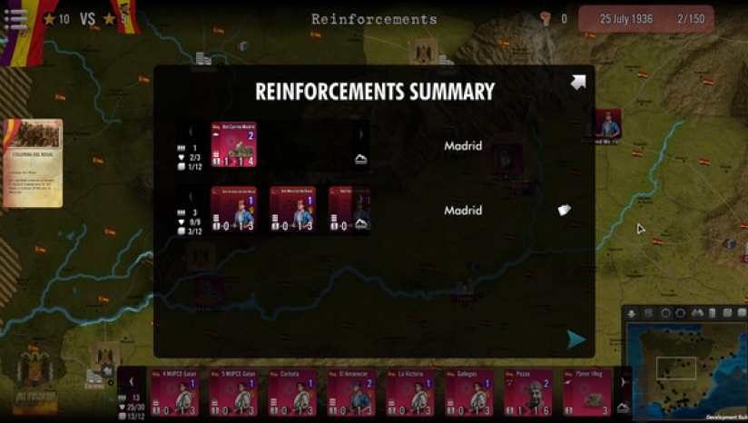 游戏涵盖了从36年7月18日开始的整个战争,采用了每周轮流的制度。作为国民党,你必须把你的非洲军队的强大部队带到半岛,控制关键城市,迫使共和国投降。作为共和党玩家,你必须延迟敌人的最初进展,同时开始建立人民军,以便准备好面对对手的正规军,特别是其老兵部队。