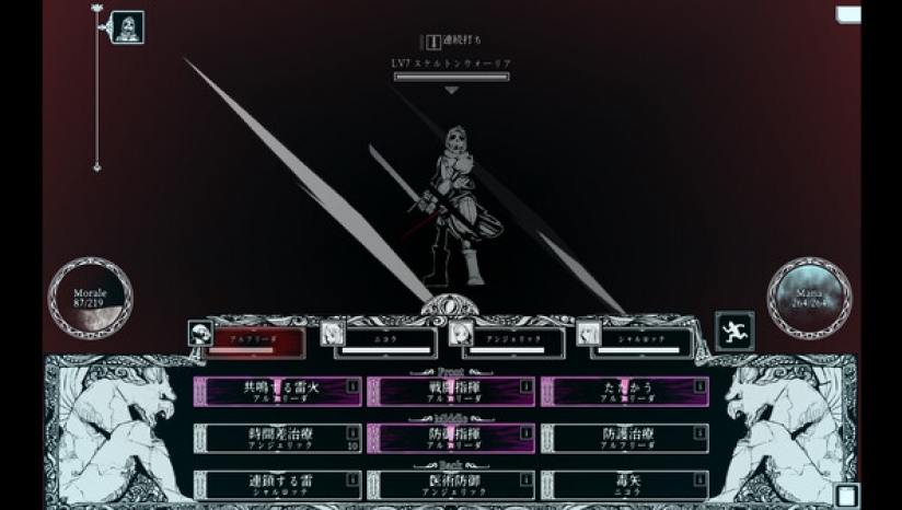 战斗将通过重复这些步骤来完成。你想在战斗中使用的技能将在战斗前由9个面板组成的“构成面板”中设置。战斗的结果将受到技能和你在构成面板中的技能位置的极大影响。构成面板将由各方共享,本游戏的一个独特功能是介绍如何使用您拥有的有限数量的小组。