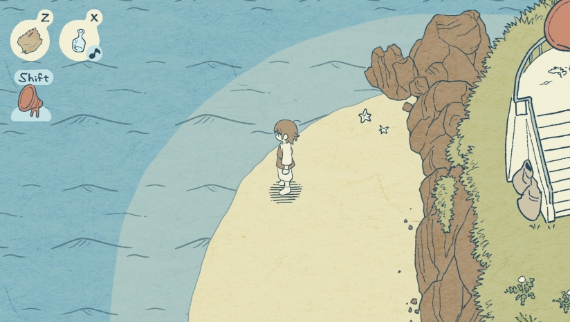 采用手绘风格美术,线条简约柔和,色彩以淡雅蓝色调和沙滩暖色为主,营造宁静孤岛氛围。场景元素虽少(灯塔小屋海岸),但细节生动,如随风摇曳的草木浪花纹理,与音效结合强化治愈感。角色与物品的歪扭手写字体UI进一步烘托质朴气质。