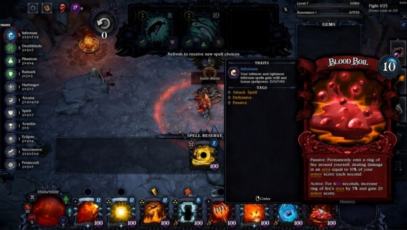 在每场战斗前刷新你的法术商店,寻找适合你的法术,记得三个同类法术可以升级哦。