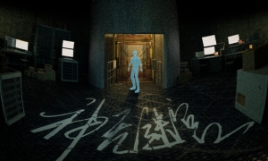 游戏采用独特的蓝色剪影美术风格,所有角色以深蓝色轮廓呈现,强化科幻悬疑氛围,同时隐喻量子态的“不确定性”。场景以冷色调为主,地下实验室的金属管道、幽暗走廊与闪烁的实验仪器构筑压抑的封闭空间。动态演出融入复古分镜手法,如关键抉择时的双门意象(呼应“一人能否同时穿过两扇门”的量子隐喻),画面简洁却富有象征性。