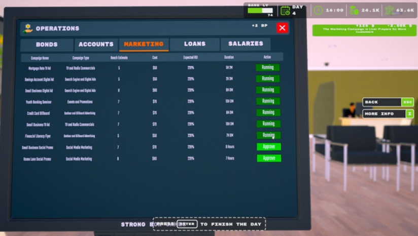 在《银行模拟器》中你需要经营一家银行,你在这里需要办理各种业务,以出纳员,营销和投资为特色,并使用ATM等扩展,建立属于自己的团队,为更快乐的客户升级设施,而且你还需要巧妙地进行投资。