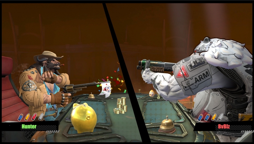 游戏以「俄罗斯轮盘赌」为核心机制,每局随机装载实弹与空包弹,玩家需选择向自己或对手开枪。若对自己开枪命中空弹,可获得连续开枪的机会,将压力转嫁敌人。独创的「亡命值系统」打破传统战斗逻辑:只要攻击他人即可积累亡命值,即使血量归零也能触发反杀,让每一次博弈都充满变数。游戏还融入策略性道具组合,例如先使用「保养组件」提升伤害,再通过「连发模式」实现瞬间爆发,或是利用「赏金标记」锁定高价值目标,击杀后获得额外收益。多人模式支持3人乱斗与2V2组队,玩家需在合作与背叛间灵活切换,争夺「废土之王」的称号。