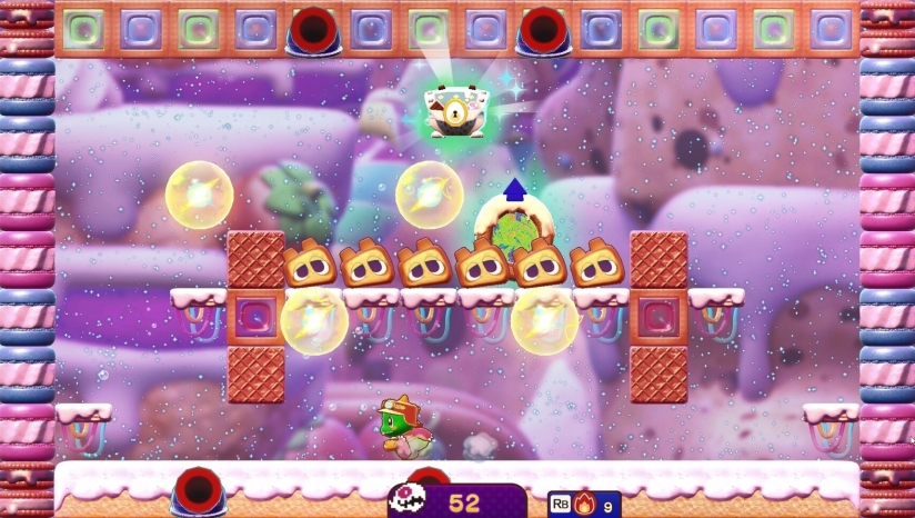 游戏延续系列标志性明快卡通风格,以高饱和色彩渲染甜点主题世界。场景融合饼干城墙、糖霜地表等元素,敌人设计采用软糖、巧克力等拟态造型,营造童话般的视觉氛围。动态光影与泡泡透明质感增强层次感,搭配清脆爆破音效与轻快配乐,打造沉浸式冒险体验。