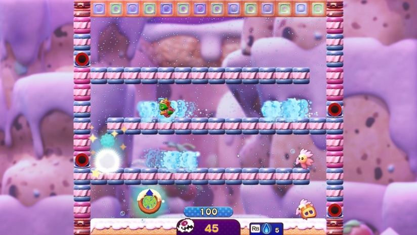 玩家需利用巴比的泡泡吐息能力困住敌人,再以尖刺击破泡泡将其消灭。游戏创新引入动态物理机制:泡泡可随风飘移,玩家可踩踏泡泡跃至高处。关卡设计弱化了传统清版要求,玩家可通过困住障碍敌人解锁传送门,灵活选择推进路线。成长系统是本作核心革新:玩家收集迷宫宝物可觉醒新技能(如经典“水泡泡”回归),并自由组合技能道具携带顺序与强化路线,形成个性化战斗风格。此外,游戏包含双人合作模式,支持组队挑战迷宫。
