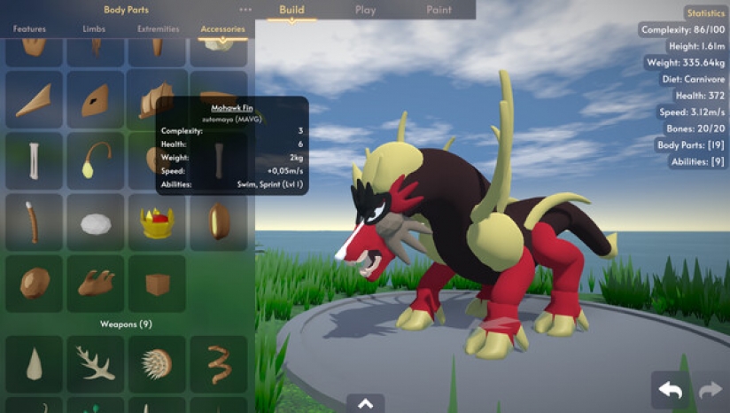 在建造模式中,您可以通过操纵其脊椎来自定义生物的形状,并附加可变换身体部位。更改您的生物会更改其统计数据(例如重量,速度,健康等),并附加某些身体部位会使其具有特殊能力(例如飞行,游泳,咬等)。