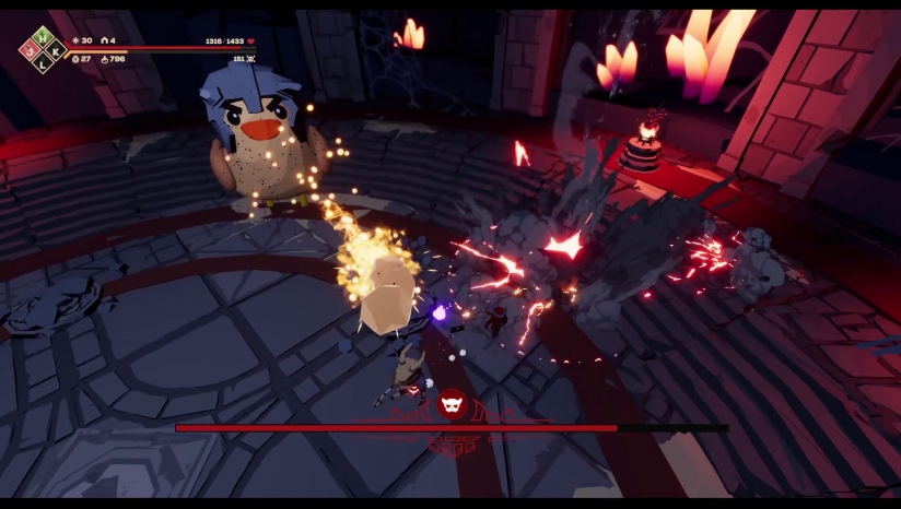 游戏采用3D卡通渲染风格,角色与场景设计兼具奇幻色彩与诙谐元素。战斗特效突出物理互动:武器挥动轨迹带有粒子光效,爆炸场景伴随碎片飞溅;敌人受击时的布娃娃动画流畅夸张,增强战斗爽感。场景设计涵盖幽暗地牢、中世纪城堡及异界生态,配合明快的色彩对比,在保持奇幻基调的同时优化视觉辨识度,利于玩家在混乱战斗中快速反应。