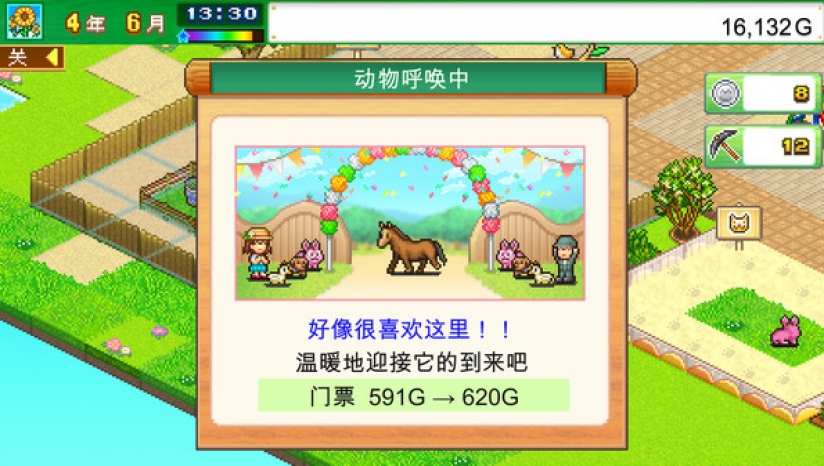 简中《发现动物公园(Wild Park Manager)》是一款由Kairosoft Co.,Ltd开发制作并发行的模拟经营类游戏。游玩、钓鱼、赏花、吸引动物朋友!用镐头在这里挖挖挖!建造让客人满意的公园吧!