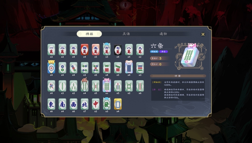 遵循基础胡牌番型(如大三元、字一色),但加入“灵俑”(类似《小丑牌》的卡牌)强化牌组。例如“罚恶司判官”被动技能可将数牌变为字牌,实现高番组合爆发。