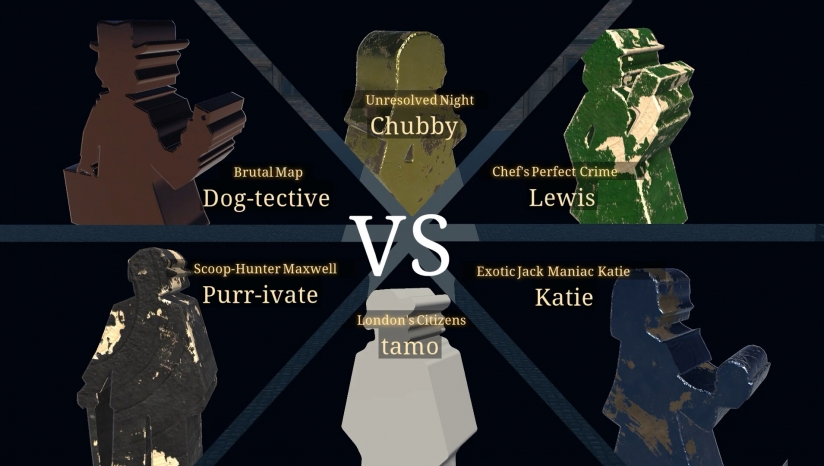 游戏采用微缩模型视角呈现俯视的伦敦街区,方格化地图精细还原白教堂区等标志性地标,昏黄光影营造维多利亚时代的悬疑氛围。角色以抽象化“桌游人偶”造型搭配高饱和度色块区分阵营;凶案动画采用剪影风格呈现,规避血腥元素,聚焦策略博弈。界面以动态轨迹线、投票热力图强化无声推理的沉浸体验。