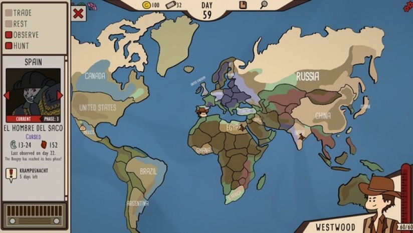 穿越世界版图,探索来自不同文化的民间传说和神话生物,一睹他们神秘的面容。在不同国家穿行将会耗费实际的天数,记住你不是来旅游的,随着时间推进,怪物会不断进化变得越来越强大,抓紧时间消灭他们吧!