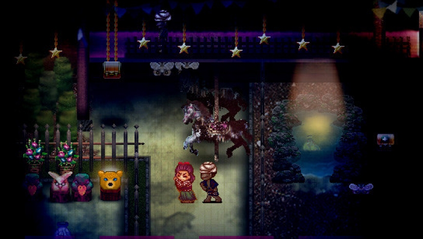 游戏采用像素复古风格,以暗色调与高对比度光影塑造夜镇“光怪陆离的怪异建筑”。场景设计兼具和风细节(如发簪、町屋)与超现实扭曲感,例如灯火间隙闪现的鬼影、雨漏吞噬浆果时的动态帧动画。人物立绘采用手绘卡通风格,配合环境音效(如滴水声、低语)深化悬疑氛围,强化“热闹与骇人并存”的独特体验。
