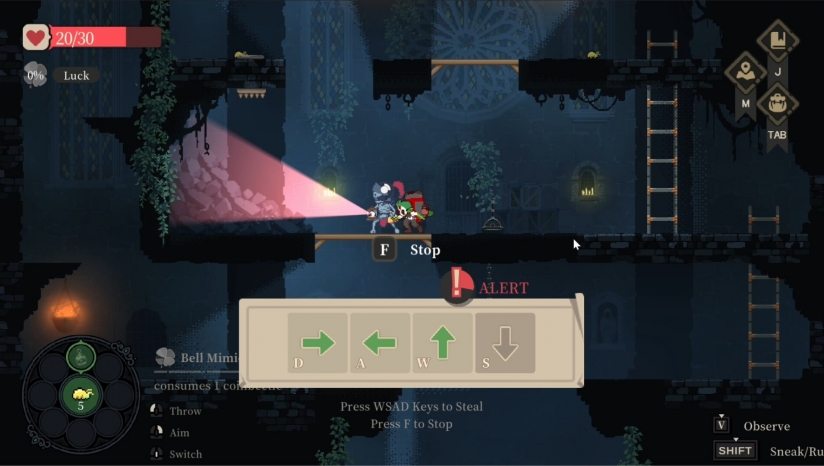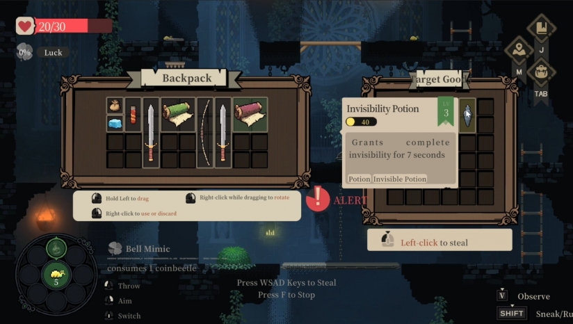 作为一名瘦小的哥布林,你无法与敌人战斗,但你可以利用各种技能和地形,巧妙地接近敌人,偷走值钱的东西,悄然离开。