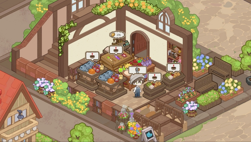 将原料加工为商品后开店,自由布局货架打造“超长购物回廊”吸引顾客,完成订单积累资金。