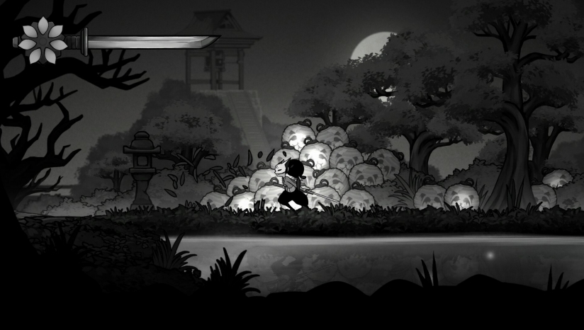 游戏采用全手绘黑白动画风格,灵感源于日本剑戟片(武士电影)。场景以水墨线条勾勒灵界的苍凉与神性,战斗中对神灵的招式特效辅以局部色彩渲染(如血红的斩击轨迹、幽蓝的冰霜之力),在黑白基底中形成极具冲击力的视觉焦点。角色动作流畅如逐帧动画,配合写意场景设计,让每场BOSS战宛如动态浮世绘。