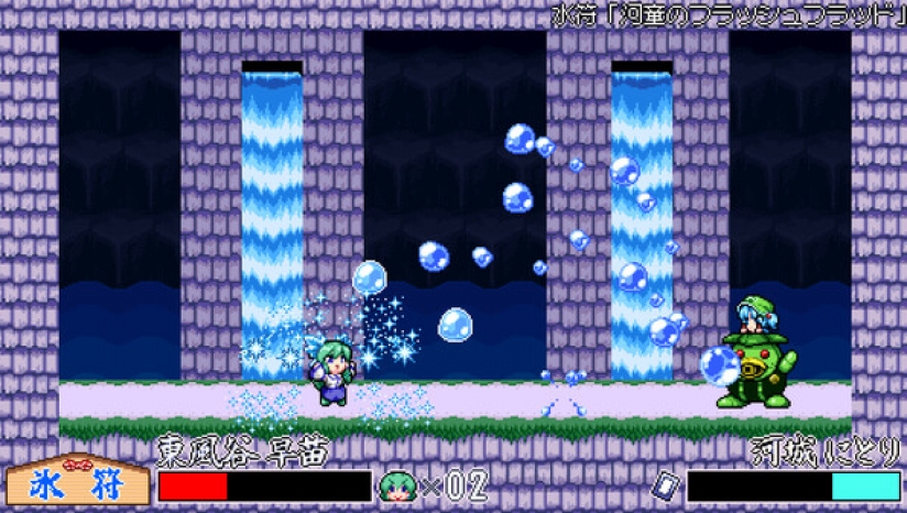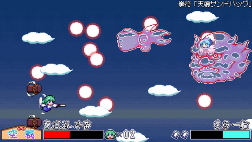 东风谷早苗可以通过冲刺、跳跃和滑动等动作轻松地穿过幻想乡。当面对一个难以攀登的高平台或一个通向深渊的洞时,她用神奇的风将自己提升!