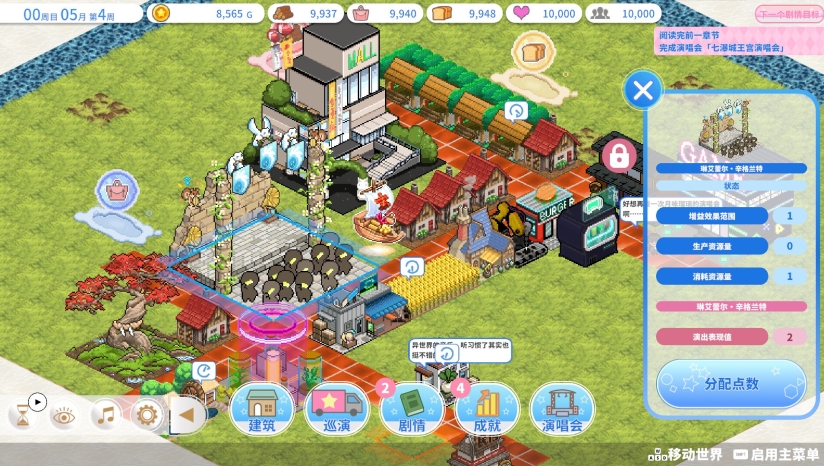 规划道路、建造设施(如练习室、粉丝广场),收集资源(人气值、资金等)逐步完善圣地功能,繁荣度直接影响偶像成长空间。