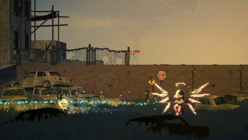 融合赛博都市与废墟景观,通过动态光影与粒子特效强化未来感。虽为像素风格,但角色立绘采用精致的日式二次元画风,形成独特视觉对比。
