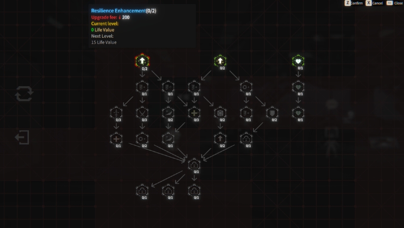 通过每轮关卡中随机出现的“塔罗牌词条”强化角色能力,词条涵盖属性增益与机制变化(如暴击特效、位移增强)。局外则通过消耗资源“拟合血液”升级科技树,永久提升基础属性。