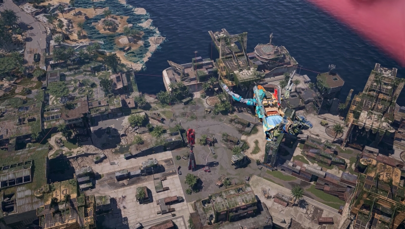 泪珠岛包含雨林废墟(Ocio)、科技都市(Stork City)等七大区域,动态光影与破损建筑细节强化反乌托邦氛围。