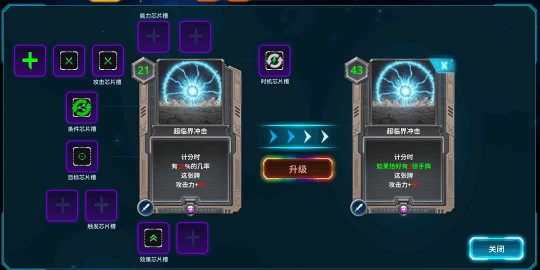 一张强力的卡牌效果,却因为触发条件太过苛刻而派不上用场?在这个游戏里无需担心!你可以任意替换触发条件、追加卡牌效果,甚至一张平平无奇的卡牌,因为你的一次升级,变为强力的卡牌!