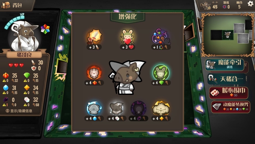 游戏采用明快卡通渲染风格,场景以色彩鲜明的网格化房间呈现,搭配动态元素特效(如魔能爆炸、岩浆流动)。角色设计充满奇幻趣味(如持剑的兔子、法杖猫咪),怪物造型融合元素生物特征(如岩石躯体、火焰纹理)。虽然画风看似轻松,但战斗动画与陷阱交互(如沼泥方格塌陷、位面传送门波动)细节丰富,强化了策略沉浸感。整体画面在兼顾休闲感的同时,通过精致的粒子效果与场景破坏反馈,提升了战斗的视觉张力。