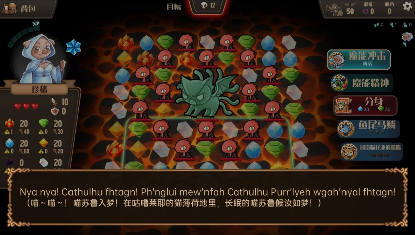 游戏融合了回合制策略、Roguelike随机性与三消机制。玩家在网格化场景中移动角色,通过消除同色元素魔能(宝石)发动攻击、触发机关或清除障碍。每个房间需完成特定目标(如击败敌人、揭示符文或激活按钮)才能解锁出口。战斗采用回合制:玩家每回合需权衡行动策略——如近战攻击、远程消除魔能或组合元素连锁(例如消除火魔能引发闪电),同时需控制“混乱等级”的累积风险。游戏含六名可选角色,各自拥有专属技能(如召唤猫猫、持盾冲击)和被动天赋,搭配百种咒术与道具(可提取或丢弃)构建差异化流派。关卡布局、物品及敌人组合均为随机生成,增强重复可玩性。