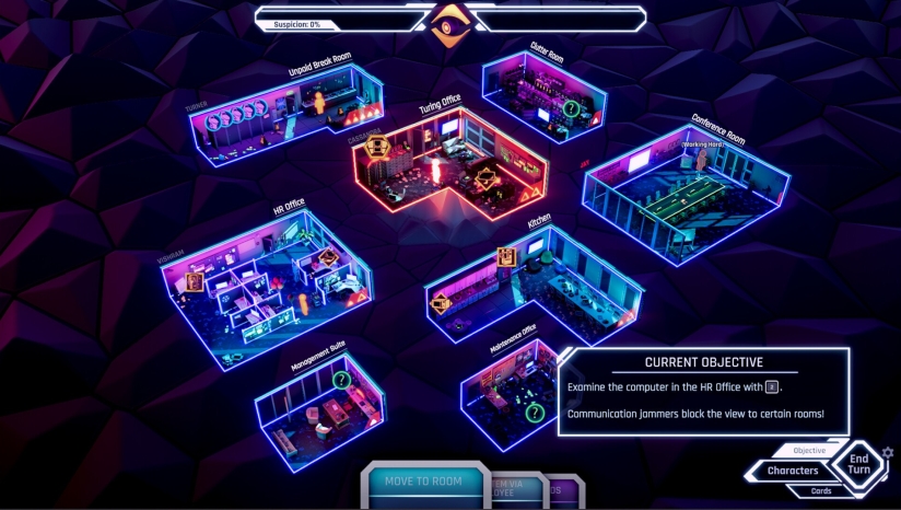 所有操作会积累“怀疑指数”。一旦被图灵部发现,游戏立即结束。玩家需在监控死角行动,或利用“黑入电脑偷牌”等技能化解危机。