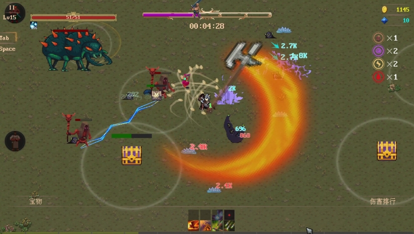 地图随机刷新宝箱,开启可获得武器(如元素弩、咒文匕首)、被动宝物(如“荆棘护甲”“疾风之靴”)或一次性道具(治疗药水、陷阱)。
