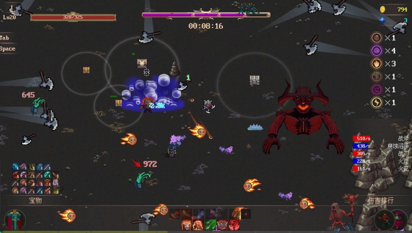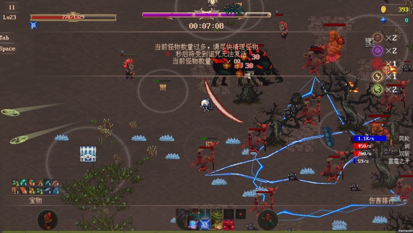 敌人随游戏时长进化——初始腐化树精2分钟后异变为毒藤巨怪,5分钟后天空出现影翼袭扰。