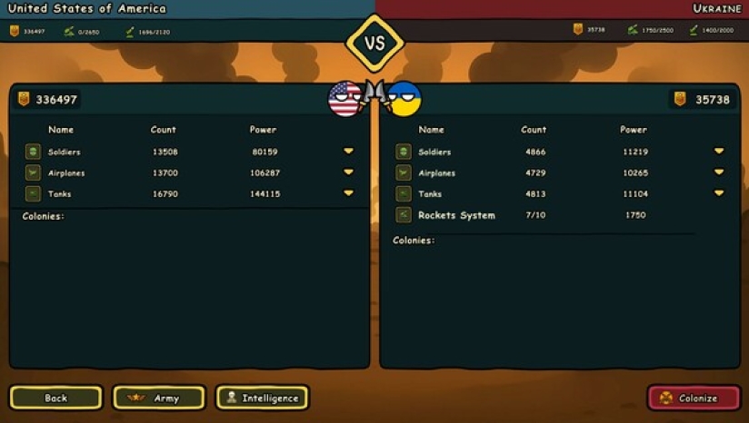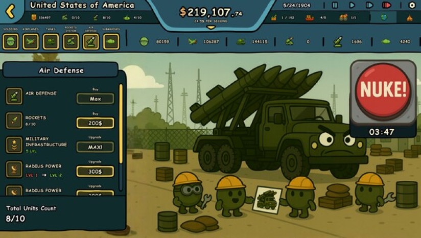 训练夸张风格的军队,部署坦克、战斗机、潜艇、导弹系统——当外交失败时,投下核弹。用荒诞幽默的Countryballs风格统治战场。
