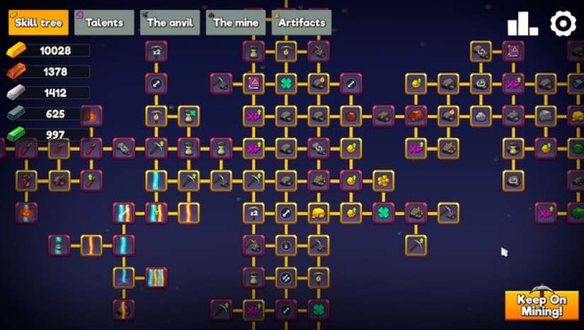 技能树!使用材料金属条在技能树中解锁升级。这些升级可永久提升属性,让你更有力地开采岩石!