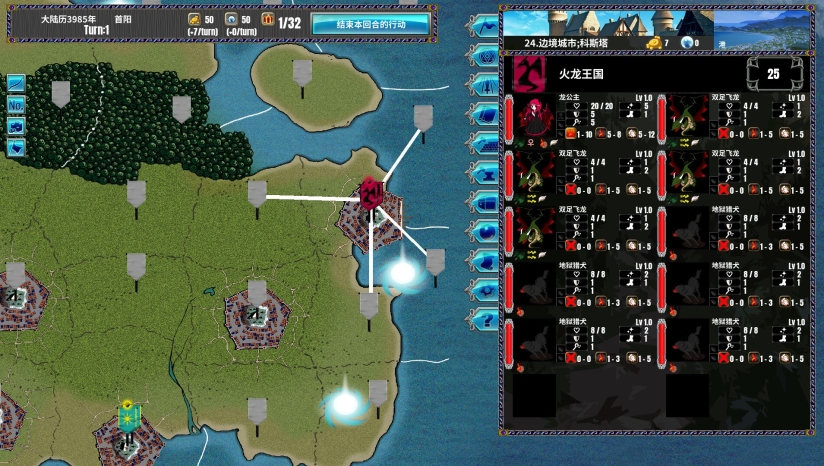 游戏采用2D美术风格,以色彩鲜明的区块化地图呈现大陆格局,战斗场景则通过单位技能特效(如火焰吐息、冰霜魔法)与动态像素动画展现。虽无3D建模,但精细的角色立绘(如黑暗精灵势力的紫黑色调设计、龙族单位的巨翼振翅动作)和技能光效强化了视觉辨识度,整体风格偏向经典奇幻策略游戏的复古质感。